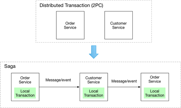 Saga与2pc的区别为,2pc通常为短事务,而saga为长事务