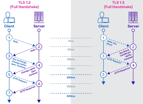 In a nutshell, TLS 1.3 is faster and more secure than TLS 1.2. One of the changes that makes TLS 1.3 faster is an update to the way a TLS handshake works: TLS handshakes in TLS 1.3 only require one round trip (or back-and-forth communication) instead of two, shortening the process by a few milliseconds. And in cases when the client has connected to a website before, the TLS handshake will have zero round trips. This makes HTTPS connections faster, cutting down latency and improving the overall user experience[1].